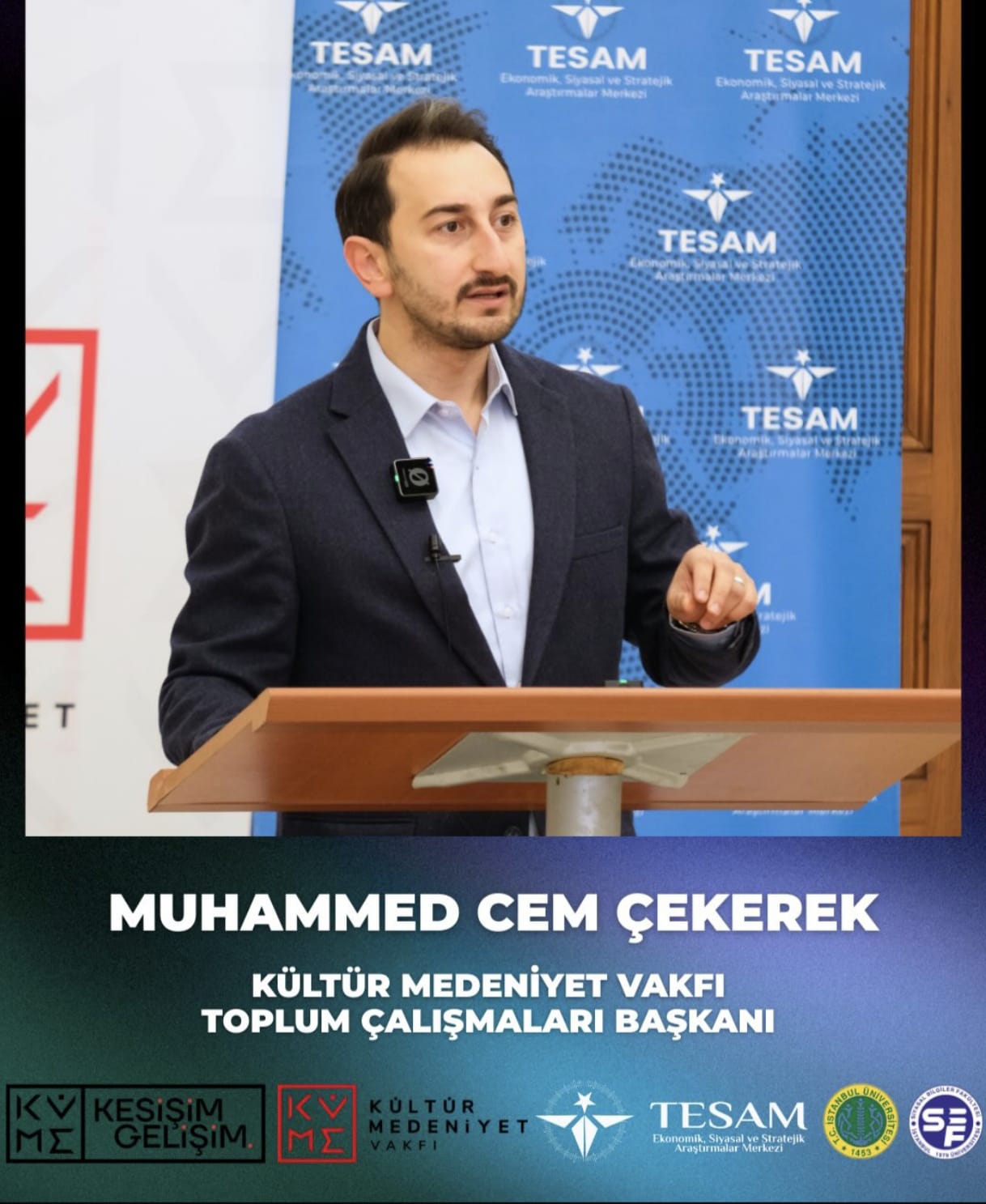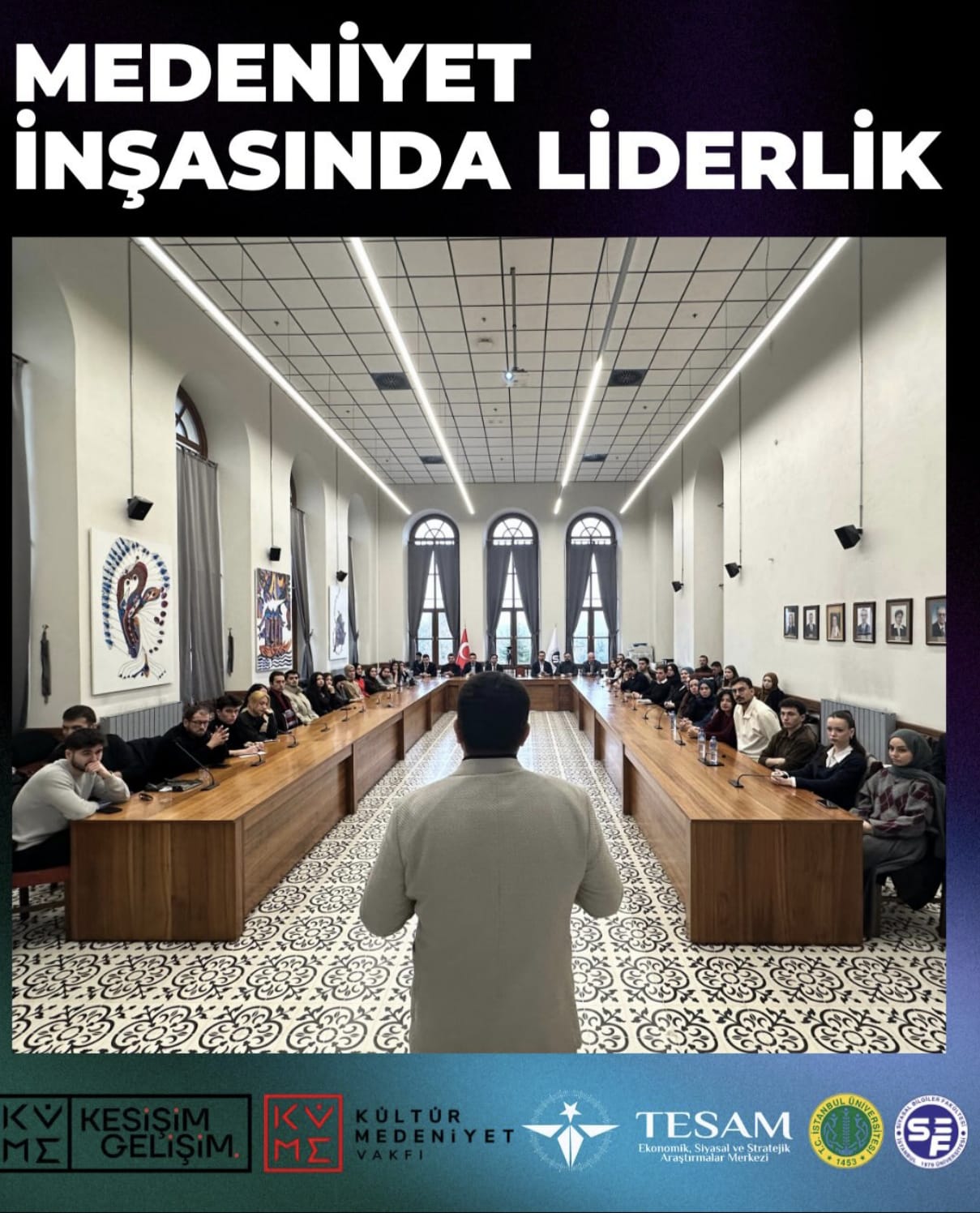 Türkiye Ekonomik Siyasal ve Stratejik Araştırmalar Merkezi (TESAM) ve Kültür Medeniyet Vakfı iş birliğiyle düzenlenen “Medeniyet İnşasında Liderlik” semineri, İstanbul Üniversitesi Siyasal Bilgiler Fakültesi’nin tarihi atmosferinde gerçekleştirildi. Programın açılışını yapan Kültür Medeniyet Vakfı Toplum Çalışmaları Başkanı Muhammed Cem Çekerek, yaptığı konuşmada sivil toplum kuruluşları ile üniversiteler arasındaki etkileşimin gençlerin vizyon inşasındaki stratejik önemine değindi.
