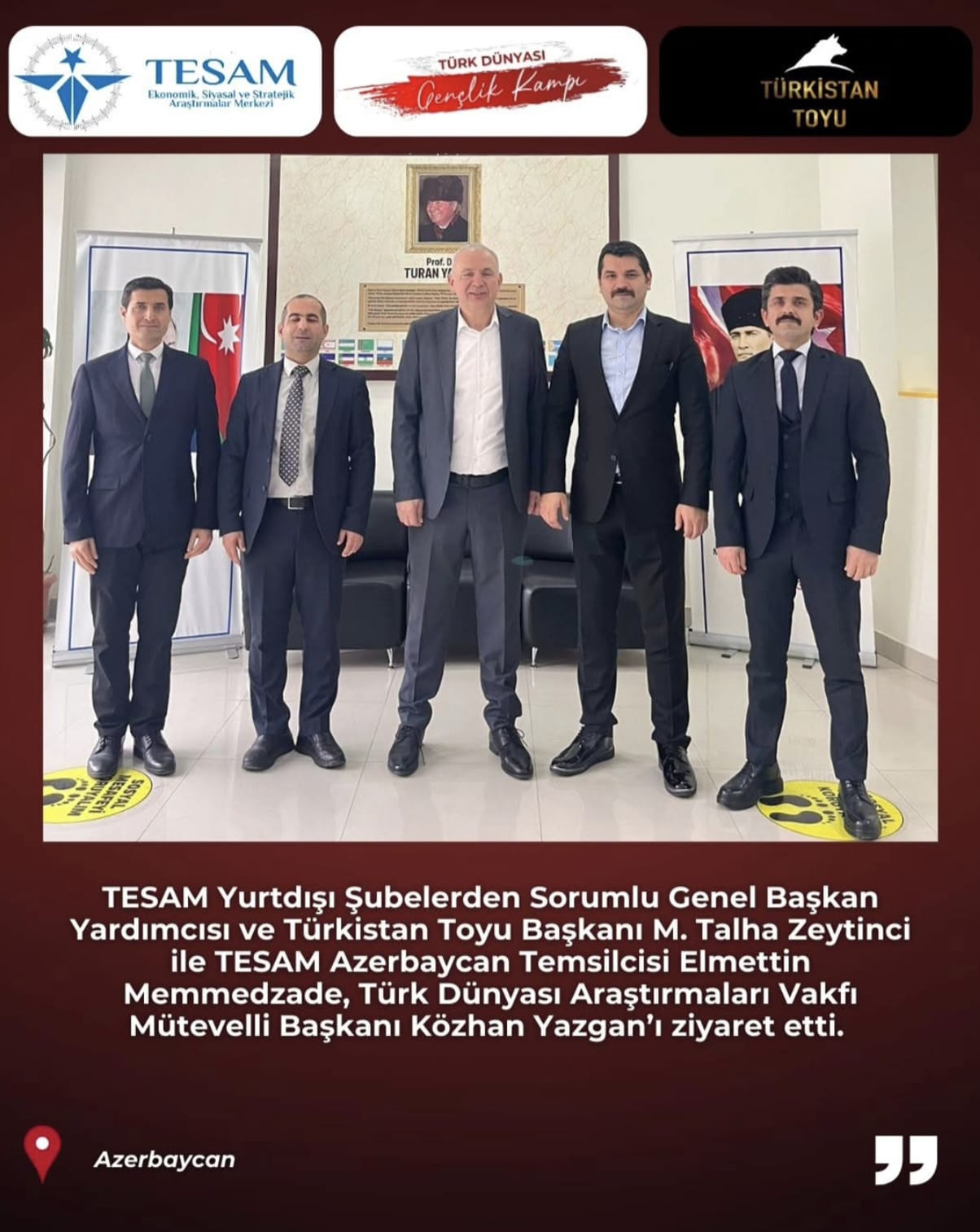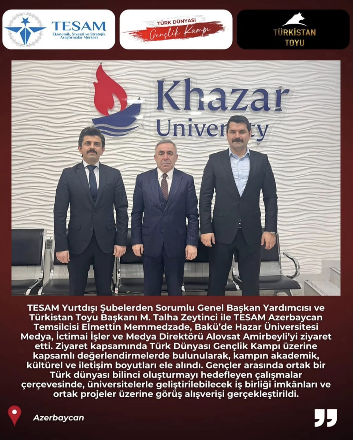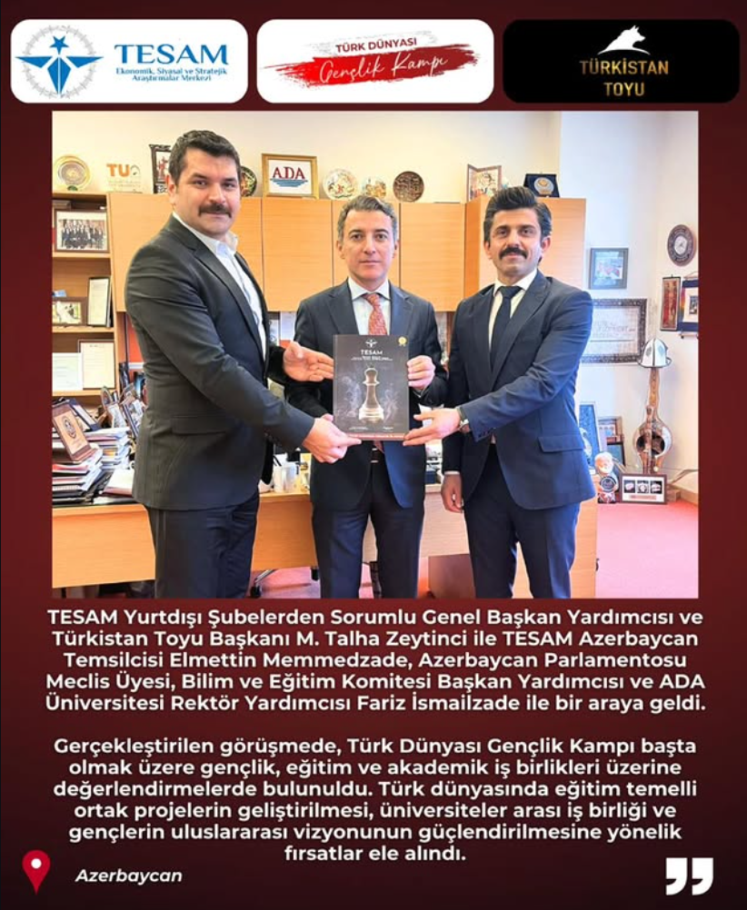 TESAM heyeti, Türk dünyası bilincini güçlendirmek ve “Türk Dünyası Gençlik Kampı” projesini hayata geçirmek amacıyla İstanbul ve Bakü’de bir dizi üst düzey ziyaret gerçekleştirdi. Görüşmelerde eğitim, medya ve sivil toplum eksenli ortak projeler masaya yatırıldı.