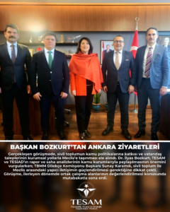 Dr. İlyas Bozkurt, ziyaretler sırasında yaptığı değerlendirmelerde, TESAM ve TESİAD’ın akademik birikimi ile hazırlanan raporların önemine vurgu yaptı. Hazırlanan sosyal, ekonomik ve akademik saha analizlerinin kamu kurumlarıyla düzenli paylaşılmasının, daha sağlıklı ve verimli politikaların üretilmesine zemin hazırlayacağını belirtti. İlerleyen süreçte sivil toplum-Meclis ilişkilerinin yapıcı bir zeminde geliştirilmesi noktasında görüş birliğine varıldı.